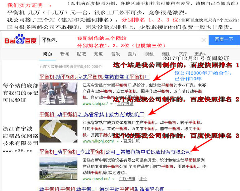 平衡機 (三個字,排名比較難) 我公司接了三個站(建站和關鍵詞排名),百度快照分別排名1、2 、3名 (360搜索等其它搜索引擎也排名挺好)...